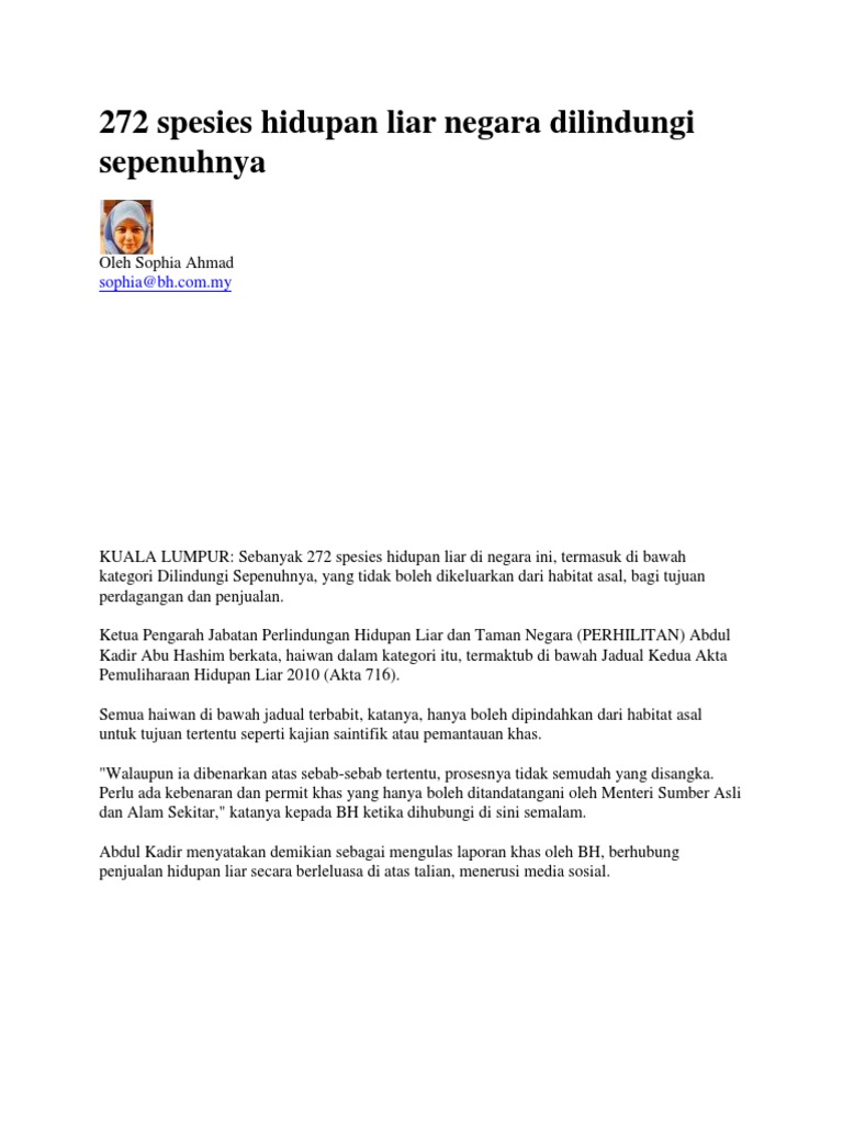 The cookies we use on Flipsnacks website help us provide a better experience for you. Jadual spesies ini boleh dirujuk di Senarai Spesies Di. Sebanyak 272 spesies hidupan liar di negara ini termasuk di bawah kategori Dilindungi Sepenuhnya yang tidak boleh dikeluarkan dari habitat asal bagi tujuan perdagangan dan penjualan.